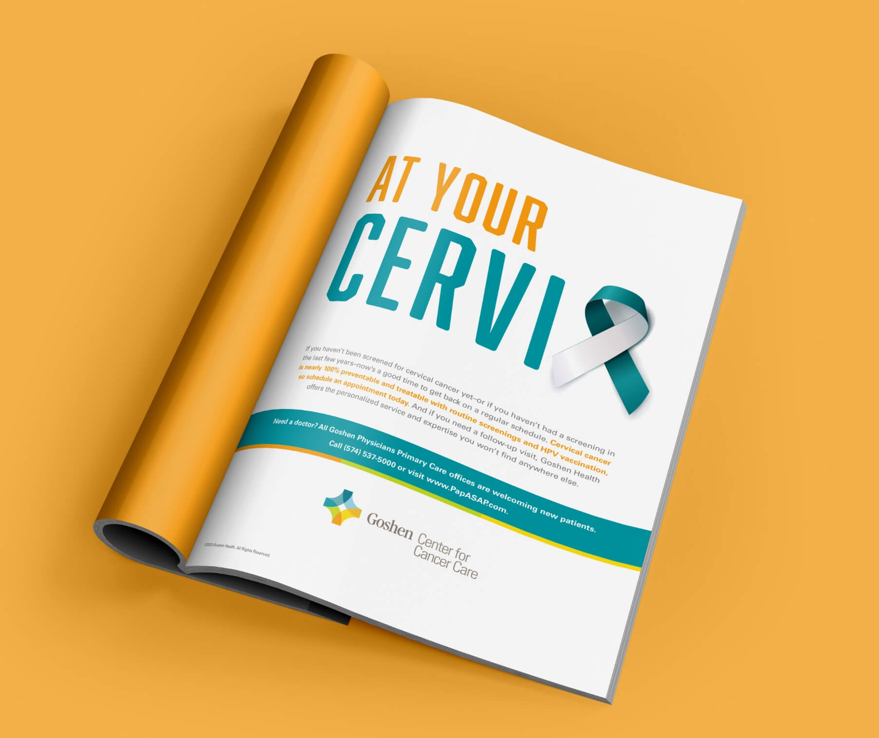 A journal ad pairs the recognizable white and teal ribbon signifying